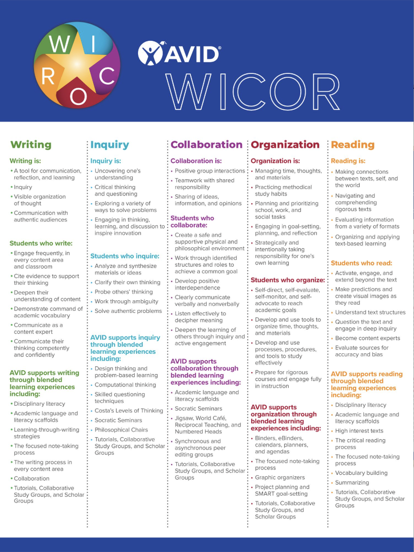 Our classrooms use the WICOR framework — Writing, Inquiry, Collaboration, Organization, and Reading — to actively engage students in their learning. Through WICOR strategies, students learn to think critically, ask meaningful questions, communicate effectively, and take ownership of their education.